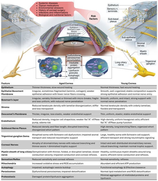 Structural and functional differences between aged and young cornea. Illustration and summary table depicting age-related alterations in corneal layers, cellular compartments, and neuronal structures. Aged corneas exhibit epithelial thinning, irregular basement membrane, reduced nerve density, mitochondrial and peroxisomal dysfunction, impaired proteostasis, and delayed wound healing, in contrast to the intact architecture and efficient repair capacity of young corneas.