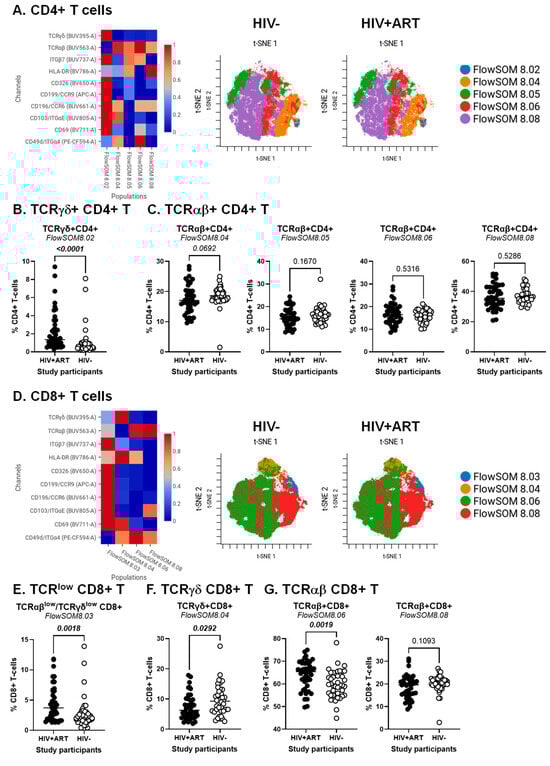 Identification of CD4+ and CD8+ T-cell subsets differentially expressed in ART-treated PWH vs. HIV-uninfected participants. The flow cytometry staining of PBMCs from HIV + ART (n = 42) and HIV− (n = 40) participants was performed as detailed in the Figure 1 legend. Analysis was down-sampled to 50% and analyzed using CellEngine with a perplexity = 100 and a number of nearest neighbors (k) = 400. Channels were rescaled equally on CellEngine. (A–G) Shown are heatmaps and tSNE plots generated from supervised flow cytometry data analysis of (A–C) CD3+CD4+ T-cells and (D–G) CD3+CD8+ T cells with differential expression of TCRγδ or TCRαβ, together with CD326, CCR6, CCR9, Itgα4, Itgβ7, and/or ItgαE. Shown are statistical analyses of the frequency of CD4+ (B,C) and CD8+ T-cell subsets (E–G) with TCRγδ+ (B,F) TCRγδlowTCRαβlow (E), and TCRαβ+ phenotypes (C,G). Mann–Whitney p-values are indicated on the graphs.