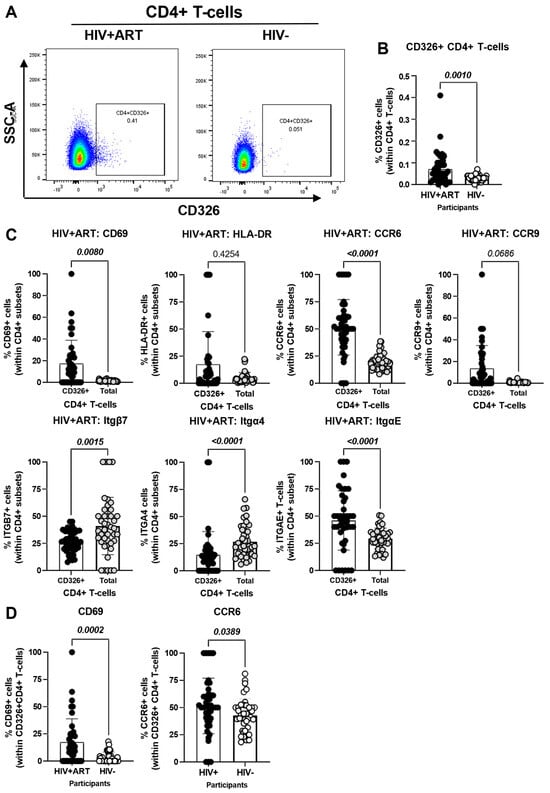 Frequency and phenotype of peripheral blood CD326+ CD4+ T-cells in HIV+ vs. HIV− participants. The flow cytometry staining of PBMCs from HIV + ART (n = 42) and HIV− (n = 40) participants was performed as detailed in the Figure 1 legend. The flow cytometry analysis was performed by manual gating using the Flow Jo software, as depicted in Figure S1. Shown are the representative gating strategy for the identification of CD326+ CD4+ T-cells (A) and statistical analysis of their frequency (B) in HIV + ART vs. HIV− participants; and (C) the expression of activation stained with a cocktail of molecules (CD69 and HLA-DR), and gut-homing chemokine receptors (CCR6 and CCR9) and integrins (Itgβ7, Itgβ4 and ItgαE) on CD326+ CD4+ T-cells of HIV+ participants, as well as differences in CD69 and CCR6 expression between CD326+ CD4+ T-cells of HIV+ vs. HIV− participants (D). Mann–Whitney p-values are indicated on the graphs.