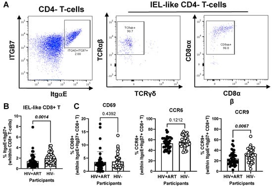 Frequency and phenotype of peripheral blood CD8+ IEL-like T-cells in HIV+ vs. HIV− participants. (A–C) PBMCs from HIV + ART (n = 42) and HIV− (n = 40) participants were stained with a cocktail of fluorochrome-conjugated Abs, as detailed in the Figure 1 legend, to allow the identification of CD8+ T-cells (CD45+CD3+CD4−TCRαβ+) with an IEL-like phenotype (Itgβ7+CD103/ItgαE+CD8αα+) and the analysis of their CD69, CD196/CCR6, and CD199/CCR9 expression. Shown are representative dot plots for the identification of Itgβ7+CD103/ItgαE+ CD4− T-cells (left panel) and their co-expression of TCRαβ/TCRαα (middle panel) and CD8αα/CD8αβ (right panel) (A) and the statistical analysis of the frequency of circulating IEL-like CD8+ T-cells in HIV+ vs. HIV− participants (B); as well as the expression of CD69, CCR6 and CCR9 on IEL-like CD8+ T-cells from HIV+ vs. HIV− participants (C). Mann–Whitney p-values are indicated on the graphs (B,C).