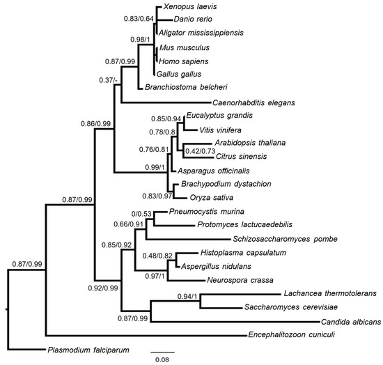 The phylogenetic analyses of the 128 and 26 selected species were also performed with different algorithms (Figure 4 and Figure S4). The analyses showed that the evolution of the Cwf14 sequences broadly coincided with the evolution of the main eukaryotic kingdoms and divisions (Figure 4). However, the topologies of the phylogenetic trees within divisions did not correspond clearly to the known phylogenetic relationships of the species (Figure S4). The former phenomenon and the substantially different branch support values of the trees indicated that species-specific residue changes could occur (especially among fungi and protists) (Figure S4).