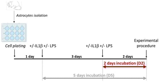 To simulate a cellular stress similar to neuroinflammation, we exposed primary astrocytes to key pro-inflammatory triggers, IL-1β and LPS, at two time points. Figure 1 illustrates the experimental protocol, detailing the timing of treatments and sample collection used to analyze the impact of inflammation on the astrocytic physiological functions. Astrocytes isolated from newborn mice were incubated for either 2 or 5 days with IL-1β, LPS, or a combination of both.