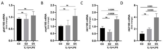 We next investigated the mRNA expression of ucp4, a mitochondrial uncoupling protein that regulates membrane potential during oxidative phosphorylation and prevents excessive reactive oxygen species (ROS) production. Ucp4 transcript levels remained unchanged in response to the pro-inflammatory treatment (Figure 6B), indicating that mitochondrial respiration is not markedly affected. In contrast, the transcripts encoding the hexokinase 1 and 2 (hk1 and hk2), enzymes that catalyze the first step of glycolysis, were both significantly upregulated after 5 days of IL-1β/LPS treatment (Figure 6C,D; 0.90 in the control vs. 1.52 at day 5 for hk1 and 1.19 in the control vs. 3.96 at day 5 for hk2).
