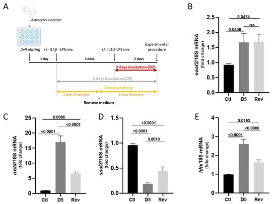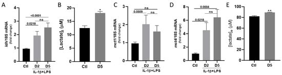 Cultured astrocytes upregulate lactate production and release in response to IL-1β/LPS treatments. (A) RT-qPCR analysis of the ldh transcripts relative to the 18S ribosomal subunit transcripts after treatment with IL-1β/LPS or control. (B) Intracellular levels of lactate in cultures of astrocytes maintained for 2 or 5 days with IL-1β/LPS or the corresponding control. (C,D) Relative quantitation of the mct1 (C) and mct4 (D) transcripts by RT-qPCR relative to the levels of the 18S ribosomal subunit transcripts upon the indicated treatments. (E) Extracellular levels of lactate from cultured astrocyte medium were maintained for 2 or 5 days with IL-1β/LPS or the corresponding control. Data are presented as the mean ± SEM of 5 experiments. Statistical significance is analyzed by ordinary one-way ANOVA with a Tukey post hoc test for multiple comparison data sets and a Ratio paired t-test; p-values are indicated on the bars. ns: non-significant. (B,E) Significance by one-sample t-test: * p < 0.05, ** p < 0.01. Data are presented as the mean ± SEM of 3 independent experiments.