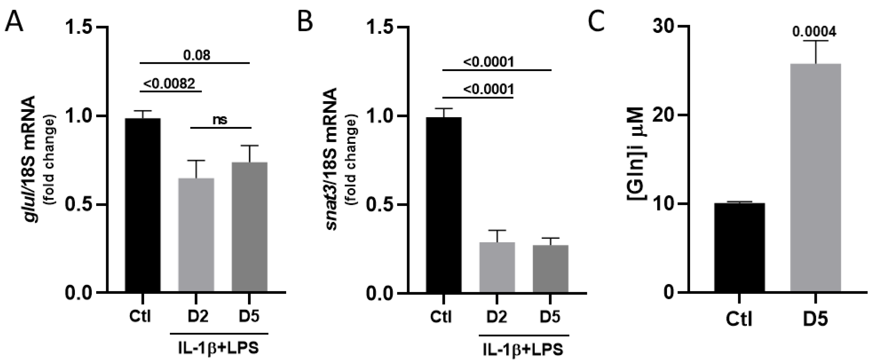 Together, these findings indicate that inflammatory stress evokes an adaptation of the glutamate-glutamine cycle in astrocytes. This adaptation leads to the intracellular retention of both glutamate and glutamine, suggesting a possible change in the neuron–astrocyte metabolic interaction during prolonged exposure to IL-1β/LPS conditions.