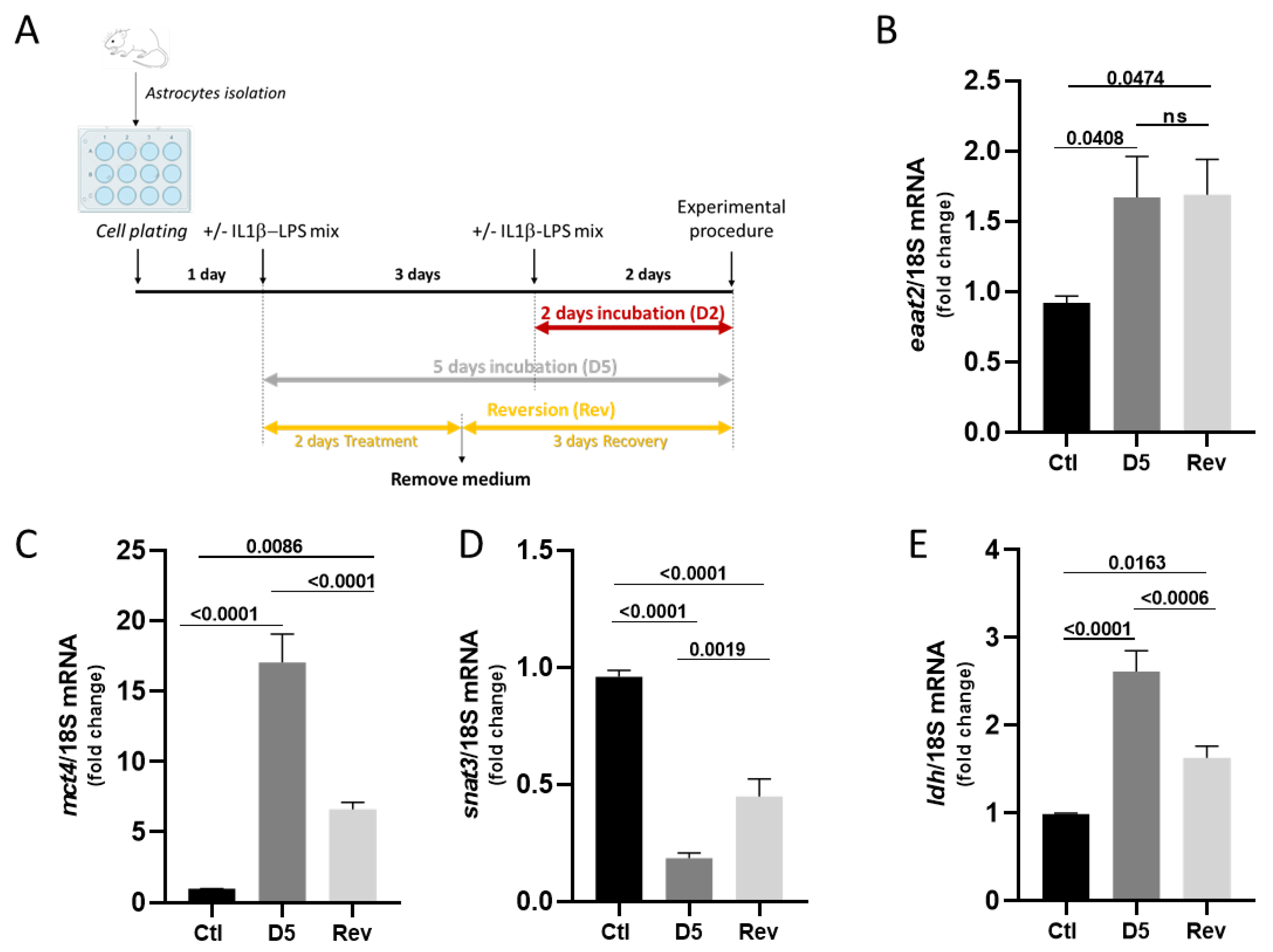 17], the primary objective of this study is to assess the long-term effects of inflammation induced by a combination of IL-1β and LPS on the expression of key genes involved in essential metabolic pathways for astrocyte function, including glutamate metabolism and clearance, lactate synthesis and transport, and glucose metabolism. The research aims to characterize the autonomous adaptive responses of astrocytes within a pro-inflammatory environment and to validate the use of primary astrocyte cultures as a pertinent model for such investigations.