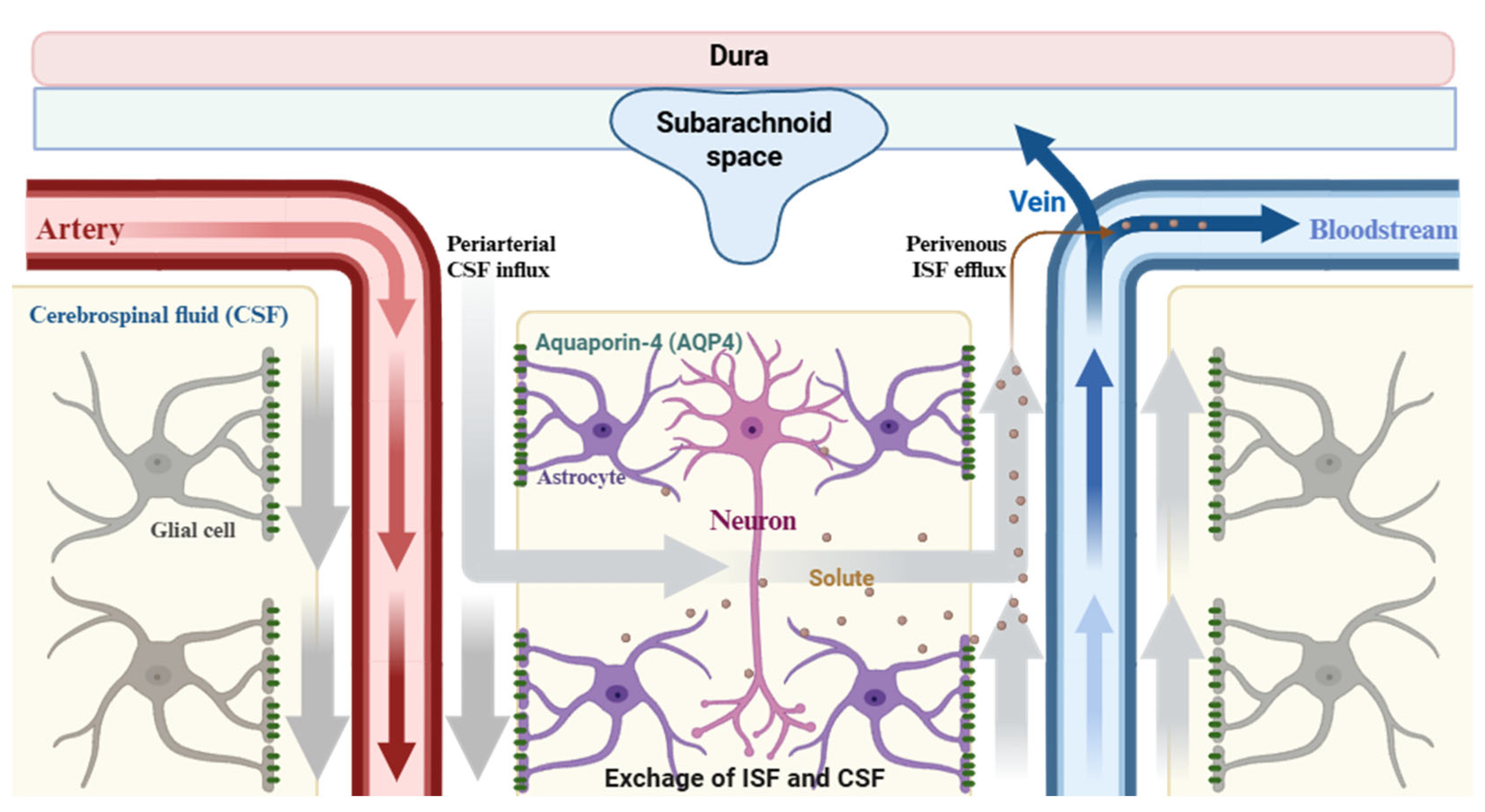 Since its initial characterization in 2012, the glymphatic system has revolutionized our understanding of how the brain clears metabolic waste and maintains interstitial homeostasis [20,45]. Unlike peripheral organs, the brain lacks classical lymphatic vessels within its parenchyma. Instead, it relies on a unique perivascular network that facilitates the convective flow of cerebrospinal fluid (CSF) into the brain interstitial and the clearance of solutes via perivenous pathways [22]. This system, termed the “glymphatic” pathway—so named for its dependence on glial cells and lymphatic-like function—is critically regulated by the water channel aquaporin-4 (AQP4), which is densely localized on astrocytic end feet [24].