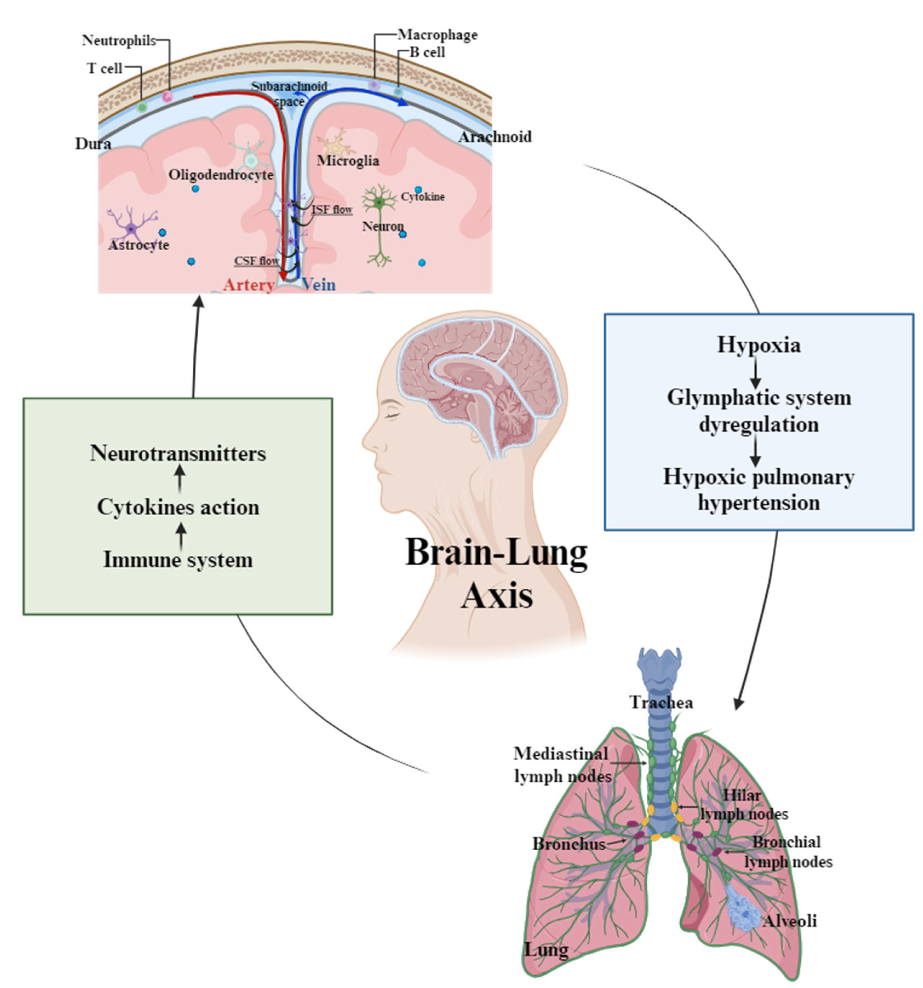 Figure 2. Representative mechanisms underlying the interaction between the glymphatic and lymphatic systems in the brain–lung axis. The figure illustrates the bidirectional communication between the brain and lungs, highlighting the roles of glymphatic circulation and neuroimmune signaling. In the brain, cerebrospinal fluid (CSF) flows along perivascular spaces and exchanges with interstitial fluid (ISF), facilitating the clearance of metabolic waste. This process involves various glial cells, including astrocytes, oligodendrocytes, and microglia. Cytokines and other immune mediators modulate neuronal activity and glymphatic function. Pulmonary hypoxia can disrupt glymphatic circulation, contributing to the development of hypoxic pulmonary hypertension. Conversely, immune responses originating in the lungs—such as cytokine release—can influence brain homeostasis via systemic immune signaling and neurotransmitter modulation. This reciprocal interaction represents a critical pathway in the pathophysiology of both neurological and pulmonary disorders.