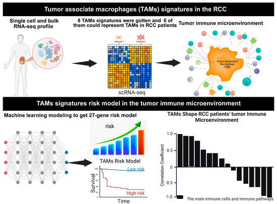 Study overview. Utilizing multiple independent single-cell RNA-seq data from human RCC samples, we crafted 8 distinct RCC TAMs signatures, and 6 of them could reflect TAMs infiltration in the RCC. We systematically investigated the role of TAM infiltration in the TIME and the prognosis of the RCC patients. A LASSO Cox regression model was developed for RCC patients’ prognosis and independently validated in multiple RCC patient cohorts. The mechanism of the TAM infiltration affects the prognosis of RCC patients through adjusting the TIME, which was also investigated in this study. Figure was created with BioRender.com.