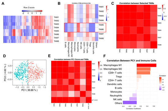 Tumor-associated macrophage profiles, immune interactions, and principal component analysis in RCC. (A) The heatmap of TAM signature infiltration scores in TCGA-KIRC patients. (B) Correlation between TAMs signatures and immune cell fractions. (C) Correlation analysis between selected TAM subtypes (TAM1, 2, 3, 4, 7, and 8). (C) Correlation between TAM signatures and immune cell fractions. (D) PCA of TAM signatures. (E) PC1 correlation with TAM signatures. (F) PC1 correlation with immune cells. The immune cell fractions in tumor samples were quantified using the quanTIseq method [32].
