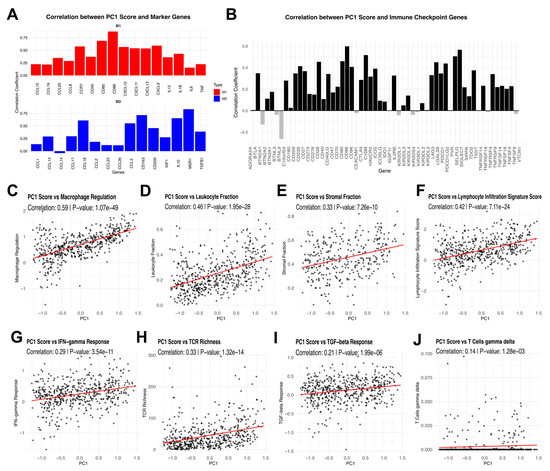 Principal component analysis of TAM signatures and their immune correlations in RCC. (A) Correlation of PC1 with M1 and M2 marker genes. (B) PC1 correlation with immune checkpoint genes. (C–J) PC1 correlation with immune-related scores and pathways, such as Macrophage Regulation, Leukocyte Fraction, Stromal Fraction, Lymphocyte Infiltration Signature Score, IFN-γ Response, TCR Richness, Transforming growth factor beta (TGF-β) Response, and gamma delta T cells (γδ T cells).