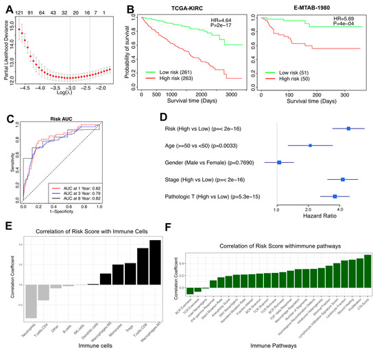 Risk model analysis for Prognostic Prediction in RCC. (A) Identification of risk genes Using LASSO regression. (B) Survival analysis based on risk scores in the TCGA-KIRC patients and the independent validation cohort E-MTAB-1980. (C) ROC curves for risk model performance. (D) Forest plot of clinical factors and risk scores. (E) Risk scores correlation with immune cells. (F) Risk scores correlation with immune-related pathways.