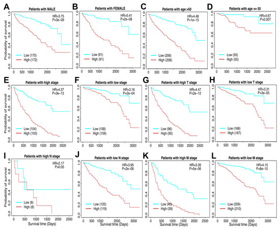 Stratified survival analysis of the risk score model in clinicopathological factors. (A) The risk model in male patients. (B) The risk model in female patients. (C) The risk model in the elderly (age > 50). (D) The risk model in the young (age ≤ 50). (E) The risk model in high tumor stage patients. (F) The risk model in low tumor stage patients. For the TNM cancer staging system, TNM stands for Tumor, Nodes, and Metastasis. T is assigned based on the extent of involvement at the primary tumor site, N for the extent of involvement in regional lymph nodes, and M for distant spread. (G) The risk model in high T stage patients. (H) The risk model in low T stage patients. (I) The risk model in high N stage patients. (J) The risk model in low N stage patients. (K) The risk model in high M stage patients. (L) The risk model in low M stage patients.