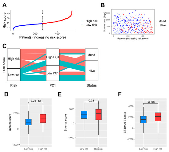 Risk score stratification and immune profiling of RCC patients. (A) Distribution of risk scores among RCC patients. (B) Survival times in low-risk and high-risk patients. (C) Alluvial diagram of risk groups, PC1 classifications, and survival outcomes. (D) Immune scores in low-risk and high-risk patients. (E) Stromal scores in low-risk and high-risk patients. (F) ESTIMATE scores in low-risk and high-risk patients.