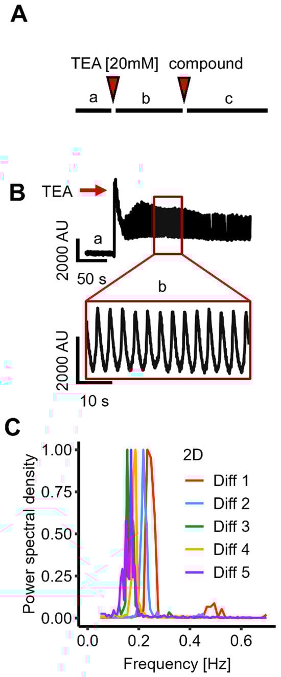 Triggering synchronized Ca2+ oscillations in conventional (2D) cultures of LUHMES neuronal-like cells at the network level. LUHMES cells were plated in 384-well plates and differentiated for a total time of nine days (d9 cultures). The differentiation medium was exchanged for oscillation medium, and cells were loaded with a Ca2+ indicator dye. Compounds were added by a robotic device. The total fluorescence of the entire well area was recorded (simultaneously for all 384 wells) continuously over time (one data point per well per time point). (A) Schematic representation of the recording protocol: (a) A two-minute baseline was recorded prior to the addition of TEA [20 mM]. (b,c) In compound screening experiments, test substances (or solvent controls) were added (c) five min after TEA. (B) Exemplary fluorescence trace (time on x-axis), showing a stable baseline, followed by robust oscillations induced by TEA. (C) A fast Fourier transformation (FFT) was performed on recordings from five independent experiments (Diff1-5) at d9 cells to analyze the oscillation frequency distribution. The FFT for each experiment shows an average of four wells per experiment (n = 20).