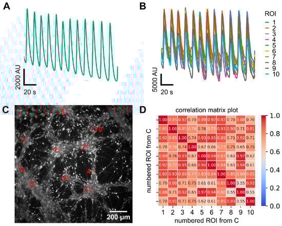 Assessment of synchronized Ca2+ oscillation in 2D-cultured LUHMES at the single cell level. Cells were treated as in Figure 1 (no test compound addition). (A) shows a fluorescence trace of an entire well with synchronized oscillatory activity. (B) Superimposed fluorescence traces from ten randomly selected regions of interest (ROIs). (C) Representative image of a 2D culture. The marked ROIs correspond to the ten cells shown in panel B. (D) The ten selected ROIs from panel C were used to generate a correlation matrix representing pairwise activity comparisons. This matrix served as the basis for calculating the global synchronization index (GSI), which yielded a value of 0.84 ± 0.02 for the 2D cultures when it was calculated from nine different experiments. Note: The apparent width of Ca2+ transients reflects calcium handling and indicator kinetics (and spatial averaging for whole-field traces) and is not interpreted as the time course of the underlying electrical events.