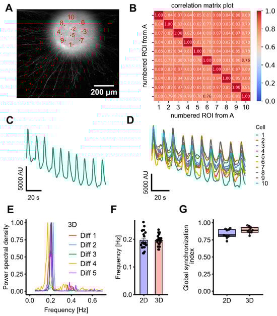 To assess network synchronization, the GSI was calculated across multiple spheroids, using ten randomly selected ROIs per spheroid. The 3D cultures demonstrated a GSI of 0.89 ± 0.02 (n = 9), reflecting a high degree of coordinated activity within a given spheroid similar to 2D cultures (Figure 3G).