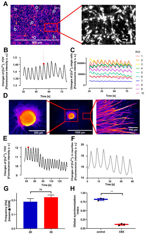 Given the complex three-dimensional architecture of the human brain, we next evaluated whether oscillatory activity could also be observed in a 3D spheroid model, based on the same cells. Large lots of LUHMES spheroids were generated in suspension cultures [37]. For experiments, single spheroids were transferred to imaging plates and left to adhere for two days. Using the same induction protocol as for the two-dimensional system, robust and long-lasting oscillations were successfully elicited in the 3D spheroids (Figure 3A–D).