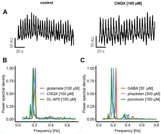 Besides some potential intracellular changes that affect [Ca2+]i, there must be a mechanism that is responsible for the coordination between individual cells. The most established mechanisms for this in the nervous system are chemical and electrical synapses [5,6,74,75,76,77]. We first examined the contribution of chemical synapses, as they play the dominant role in the mature nervous system [78,79,80]. As glutamate is by far the most important excitatory neurotransmitter in the human brain, the effect of blocking glutamate receptors was studied: we applied CNQX to block AMPA receptor-mediated signaling and DL-AP5 to inhibit NMDA receptor activity. To further evaluate the overall contribution of glutamatergic transmission, the effect of exogenous glutamate application was tested. The oscillatory activity remained unaffected by any of these interventions. A quantification of the oscillation frequency showed that none of the compounds (CNQX, DL-AP5, and glutamate) had a significant effect (Figure 5A,B and Figure S3).