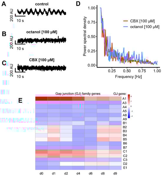 Characterization of gap junctions in LUHMES cultures. Cells were prepared for the experiments as shown in Figure 1. (A–C) The inhibition of gap junctions was performed with CBX and octanol. Representative oscillation traces are shown. (D) FFT of the fluorescence signal following CBX (n = 4) and Octanol (n = 4) treatment: no clear frequency peaks were detectable. (E) The expression level of genes coding for gap junction proteins was quantified by TempOSeq analysis. Data are presented in the form of a heat map for different differentiation days of LUHMES (x-axis). The gap junction (GJ) gene GJA1 (encoding connexin 43) is shown in the top line. Pink to red colors indicate expression levels of 4–16 counts per million reads (log2-scaled coding). The expression pattern for GJC1 and GJC2 was similar, with the highest levels in immature cells and a gradual decline (the full original data set is found in the supplementary information).