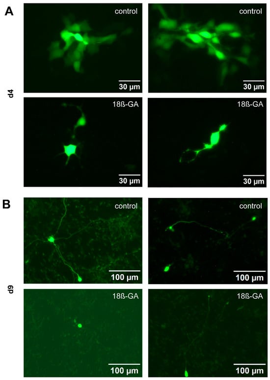 Dye transfer experiments using patch-clamp to demonstrate functional gap junction coupling in LUHMES cells. Alexa-488 was used to assess intercellular dye transfer at two differentiation stages. (A) At d4, the dye diffused to more than ten neighboring cells under control conditions (n = 6), indicating robust gap junction connectivity. Following application of the gap junction blocker 18β-GA [30 µM], dye transfer was either completely inhibited or limited to a single adjacent cell (n = 6). (B) At d9, under control conditions, dye spread was restricted to only one or two neighboring cells (n = 6). In the presence of 18β-GA [30 µM], the dye remained confined to the patched cell (n = 6).
