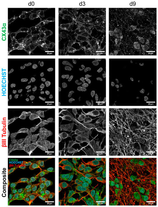 Immunohistochemistry staining for the expression of gap junction protein connexin 43α, ßIII-Tublin, and Hoechst in LUHMES cells. LUHMES cultures were differentiated for 0, 3, or 9 days on ibidi eight-well slides, respectively. The LUHMES cells were then fixed and stained with antibodies against connexin 43α, ßIII-tubulin, and Hoechst H-33342 as a nuclear stain and imaged using a confocal microscope. Connexin 43α staining is shown in green, ßIII-tubulin staining in red, and Hoechst H-33342 in blue.