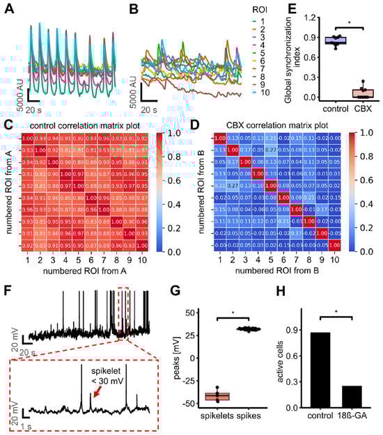 Analysis of the contribution of gap junctions to Ca2+ oscillations in LUHMES cultures. (A,B) Superimposed fluorescence traces from ten randomly selected ROIs, recorded using a high-resolution microscope, reveal synchronized oscillatory activity under control conditions (A). Following the application of the gap junction blocker CBX, oscillatory activity persists at the single-cell level, but synchrony is lost (B). (C,D) The corresponding correlation matrices indicate a highly synchronized activity under control conditions (C) but very low to no synchronized activity in the presence of CBX (D). (E) The GSI under control conditions was 0.84 ± 0.02 (n = 9). After CBX treatment, the GSI decreases significantly to 0.06 ± 0.03 (n = 9) (Welch two-sample t-Test: t = 21.326, p = 1.092× 10−12; Wilcoxon rank sum test: p = 0.0004). (F) Whole-cell patch-clamp recordings from LUHMES d9 cells under oscillatory conditions revealed small (amplitude < 30 mV) depolarization events (“spikelets”, red arrow), characteristic of gap junction-mediated electrical coupling. (G) Spikes and spikelets can be differentiated into two distinct groups. The difference was significant (Wilcoxon rank sum test: p-value = 0.0002). (H) Overall activity was decreased after the application of the gap junction blocker 18β-GA. 25% of the cells still showed spontaneous activity. The difference was significant (Wilcoxon rank sum test: p-value = 0.0016). A star (*) represents a significant difference.