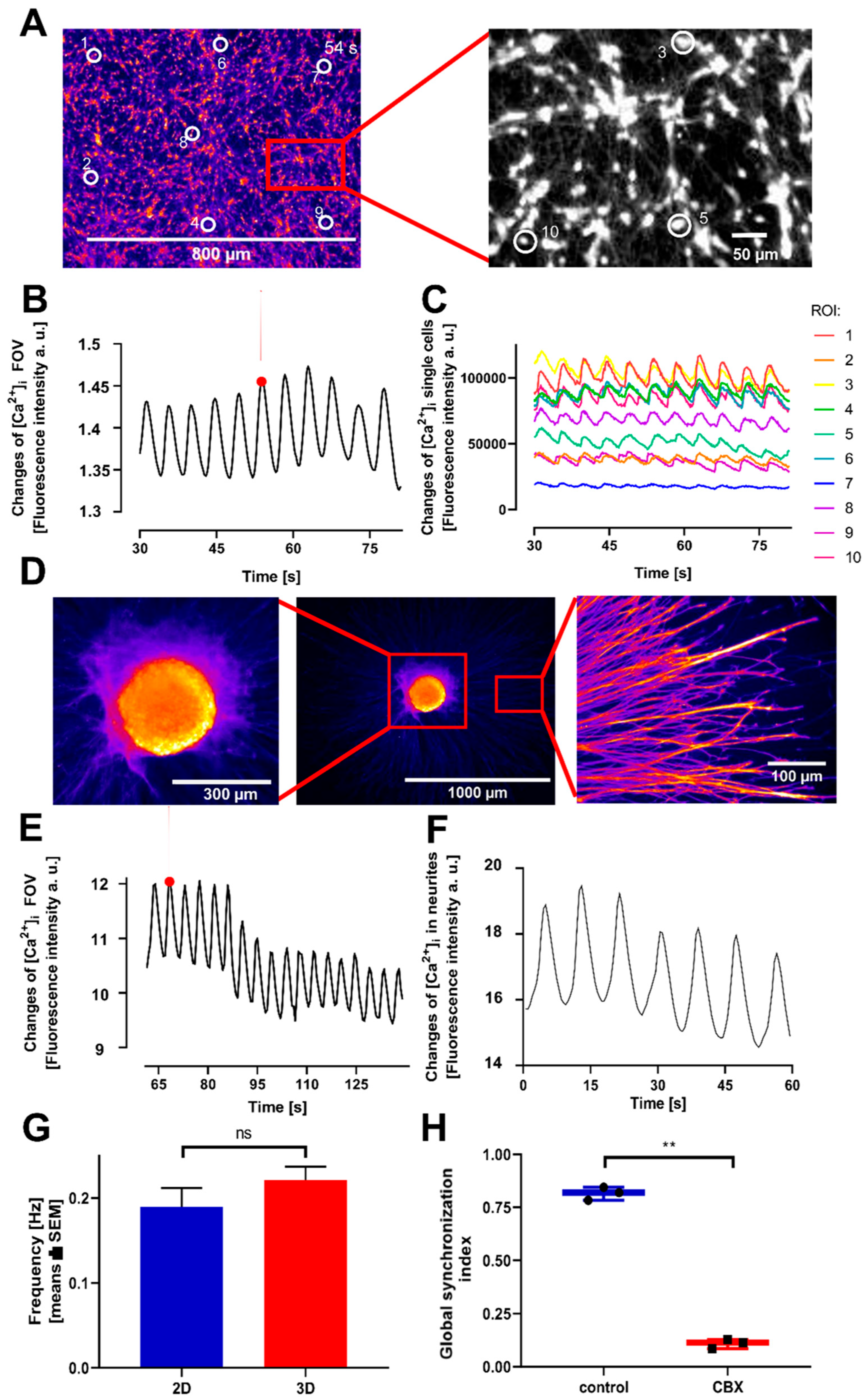 Kormann, J.; Cöllen, E.; Aksoy-Aksel, A.; Schneider, J.; Tanaskov, Y.; Wulkesch, K.; Leist, M.; Kraushaar, U. Gap Junctional Communication Required for the Establishment of Long-Term Robust Ca2+ Oscillations Across Human Neuronal Spheroids and Extended 2D Cultures. Cells 2025, 14, 1744. https://doi.org/10.3390/cells14211744