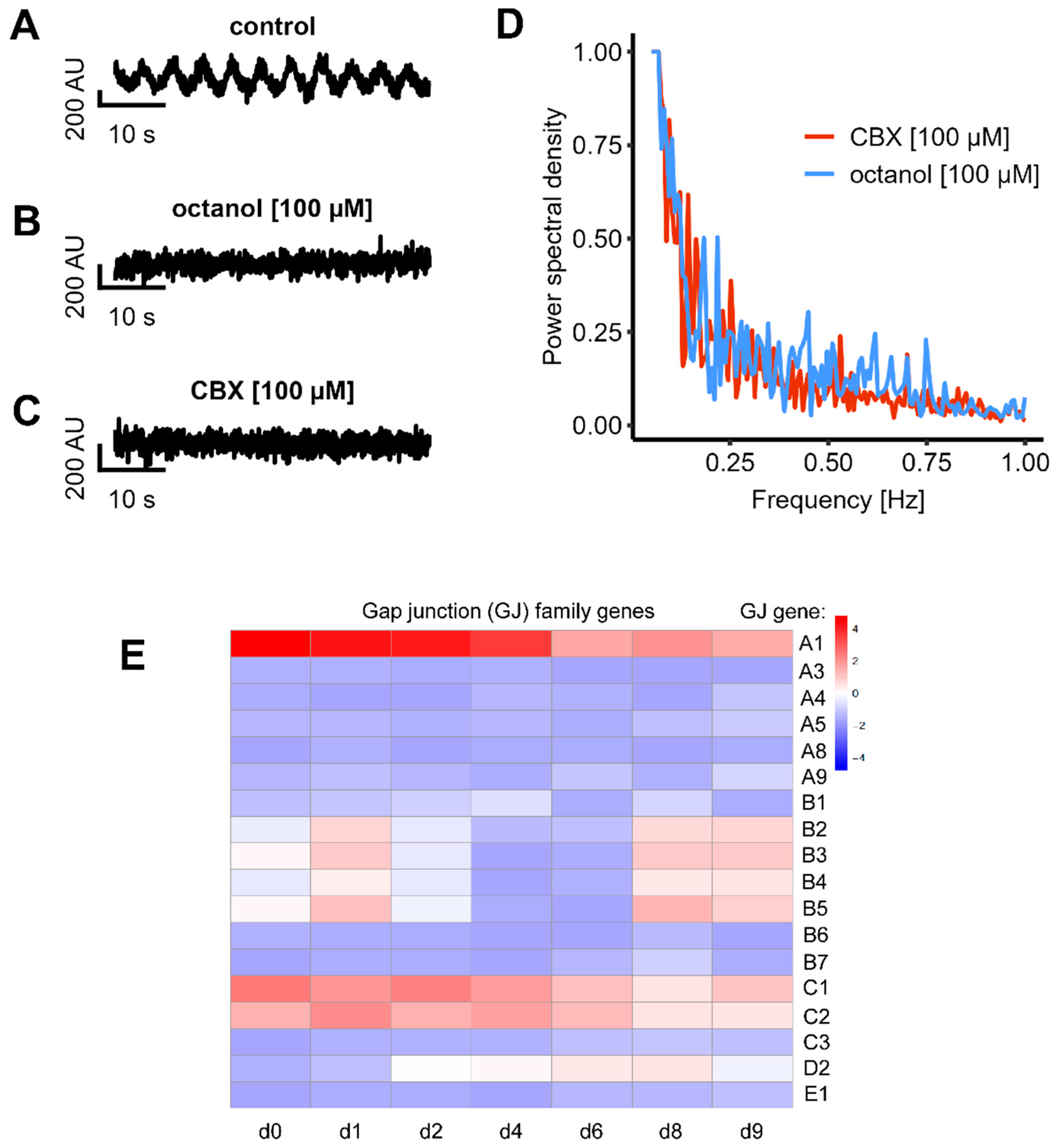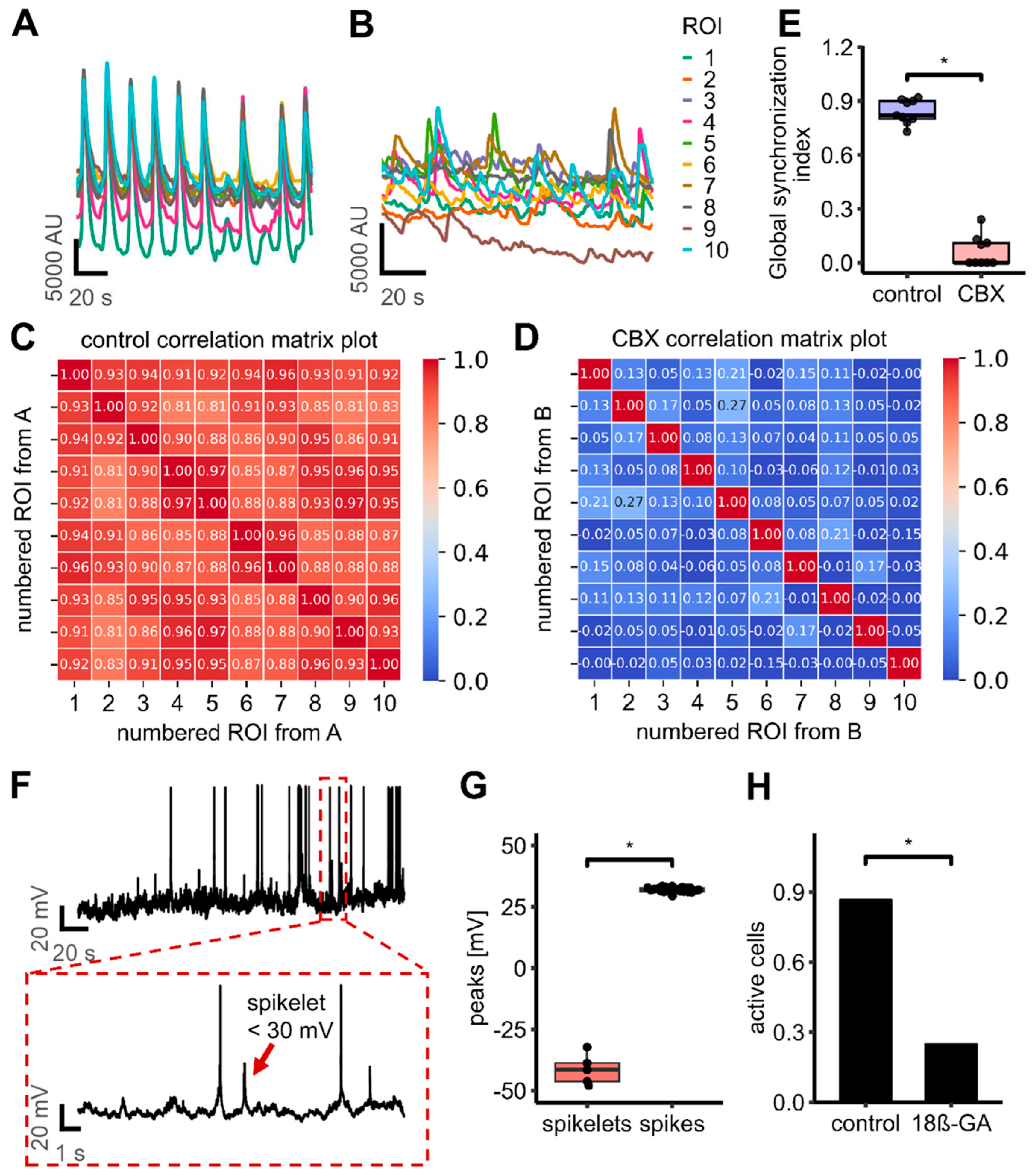 3.7. Inhibition of Gap Junctions Stops Network Connectivity, but Not Single Cell Activity