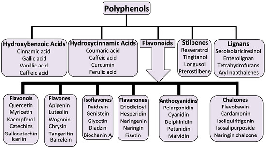 Polyphenolic (derived from the Greek word polus, meaning many) compounds are widely distributed in the plant kingdom and are a large family of structurally diverse molecules spanning phenolic acids, flavonoids, tannic acid, stilbenes, lignans, lignins, and ellagitannins []. Polyphenolics have broad antioxidant and anti-inflammatory properties (Figure 5, Table 5).