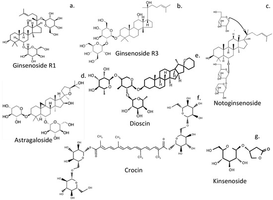 Phenolic acid and flavonoid glycosides form a varied class of naturally occurring compounds with potent anti-oxidant and anti-inflammatory properties and are more soluble than their aglycone forms and more bioavailable, making them more effective interactive molecules []. Glycoside flavonoids are transported in the gut by active transport, whereas their aglycone forms are transported through the gut by passive diffusion. Glycosides are also more soluble []. Glycosylation can also reduce any toxic effects that may be evident in some aglycone forms of these molecules, and in some cases, can improve their bioactivity [,,]. Glycosides exert anti-inflammatory, antioxidative, and anti-apoptotic effects through PI3K/Akt or JAK/STAT signaling. Some glycosides (ginsenosides, notoginsenoside, astragaloside IV, dioscin, kinsenoside, and crocin) are of interest for the treatment of IVDD [,,,,,].