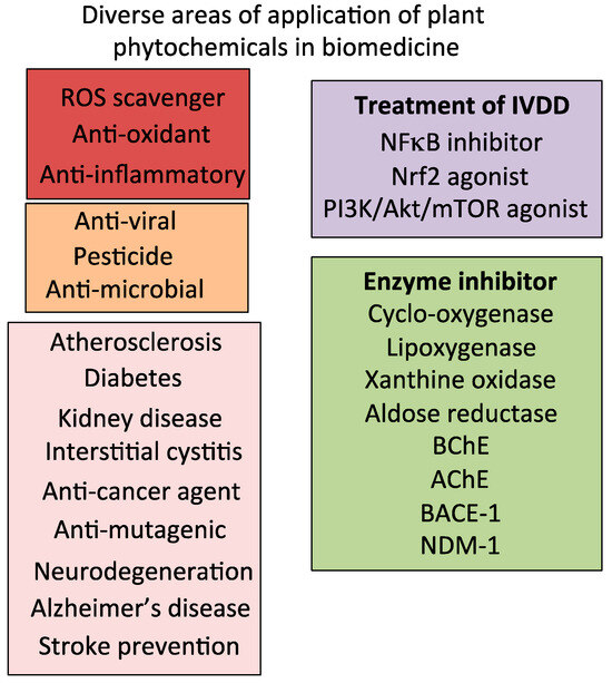 Identification of specific bioactive molecules in plant materials in traditional folkloric medicine is confounded by the complex mixture of bioactive compounds present in such preparations. Advances in functional analytical procedures for plant compounds using computational molecular docking [,,,], computer-based AI design for biomolecule assembly, and pharmaceutical network analysis for complex medicinal products [,,,,,,,], plant genomics, and informatics [], has improved the identification of roles of specific compounds in these healing procedures. A number of bioactive plant compounds have potential uses in the treatment of IVDD [,,,]. Plants have been used for healing purposes for centuries [,] in traditional Chinese and Indian medicine over the last 3000 years []. Botanical products with antioxidant, anticarcinogenic, antiallergenic, anti-inflammatory, antimutagenic, and antimicrobial activities have been harnessed in a diverse array of biomedical applications stemming from original observations gleaned in folkloric medicine [,,,].