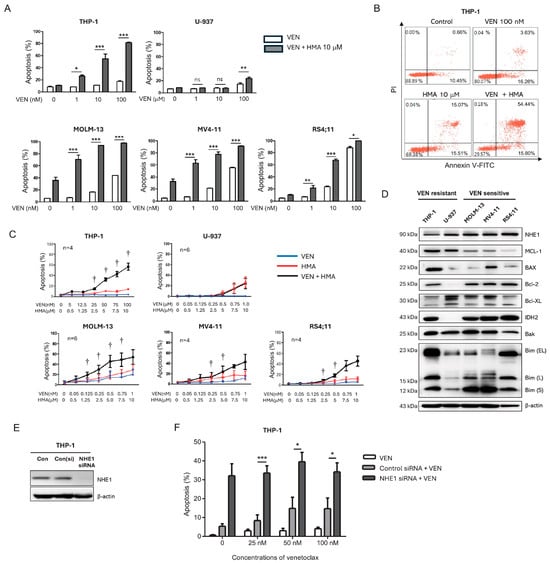 Synergistic induction of apoptosis by venetoclax and Na+/H+ exchanger 1 inhibition in venetoclax-sensitive and -resistant leukemic cells. (A) Apoptotic cell percentages 24 h after co-treatment with the BCL-2 inhibitor (venetoclax) and the NHE1 inhibitor (5-(N,N-hexamethylene) amiloride [HMA]) in five AML cell lines. (B) Scatter plot showing apoptosis in THP-1 cells 24 h following treatment with venetoclax (100 nM) and HMA (10 µM). (C) Apoptosis rates in THP-1 cells after 24 h treatment with increasing concentrations of venetoclax and HMA at fixed ratios. The combination index was calculated using CompuSyn software. (D) Western Blot analysis of NHE1 and BCL-2 family protein expression in venetoclax-resistant cells (THP-1, U-937), and venetoclax-sensitive cells (Molm-13, MV4-11, RS4;11). (E) NHE1 knockdown confirmed by Western blot following siRNA transfection in THP-1 cells. (F) Apoptotic cell rates in THP-1 cells transfected with 50 nM NHE1 siRNA and treated with venetoclax at the indicated concentrations for 24 h. Bars represent mean ± standard error of the mean (SEM) from ≥3 independent experiments. Statistical analysis was performed using one-way ANOVA followed by Tukey’s multiple-comparison test. ns (non-significant); * p < 0.05; ** p < 0.01; *** p < 0.001; † Combination index < 1. VEN, venetoclax; HMA, 5-(N,N-hexamethylene) amiloride.