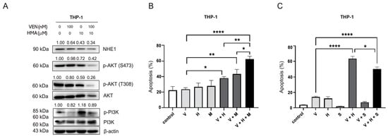 Modulation of Akt activity alters the apoptotic response to combined venetoclax and NHE1 inhibition. (A) Western Blot analysis of phosphorylated PI3K/Akt, MCL-1, BCL-2 family proteins, cleaved caspase-9, and PARP in THP-1 cells following 24 h treatment with venetoclax (100 nM), HMA (10 µM), or both. (B) Apoptosis rates after 24 h of treatment with venetoclax (100 nM), the NHE1 inhibitor HMA (10 µM), and/or the Akt inhibitor MK2206 (1 µM). (C) Apoptosis rates following 24 h treatment with venetoclax (100 nM), HMA (10 µM), and/or the Akt activator SC79 (1 µM). V: venetoclax (100 nM); H: HMA (10 µM); M: MK2206 (1 µM); S: SC79 (1 µM). Bars represent mean ± SEM from ≥3 independent experiments. Statistical analysis was performed using one-way ANOVA followed by Tukey’s multiple-comparison test. * p < 0.05; ** p < 0.01; **** p < 0.0001.