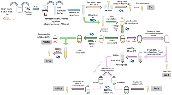All the previous findings highlight the importance of having a reliable and consistent method to isolate MAM from mammalian tissues. To help unravel the mechanism and function of MAM in cardiac tissue, we describe how to obtain highly purified MAM, mitochondria, and other subcellular fractions from murine hearts. It is important to note that the protocol can be easily modified to isolate MAM from other organs, tissues, or cell types [30].