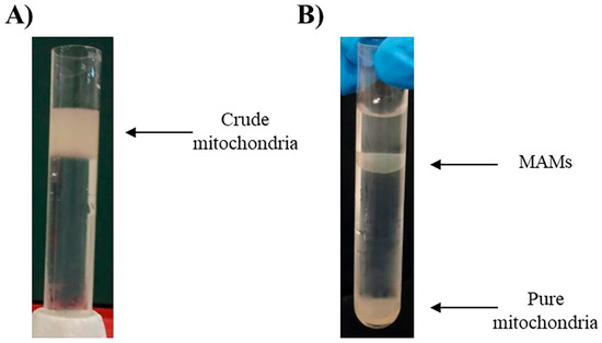 The previously isolated crude mitochondrial fraction will be placed on an 8 mL 30% Percoll® gradient column (MERCK, Rockville, MD 20850, USA) [31] (Figure 2A). The Percoll® gradient column will be ultracentrifuged at 60,000× g, 4 °C for 30 min in a swinging rotor for the separation of pure mitochondria (heavy fraction) and MAM (light fraction). Both fractions (Figure 2B) can now be extracted from the column. The fractions can be easily cleaned from Percoll® residues by washing them with 25 mL of isolation buffer followed by centrifugation at 12,000× g for 10 min at 4 °C. The pellets will contain pure mitochondria and MAM, respectively [26,32,33].
