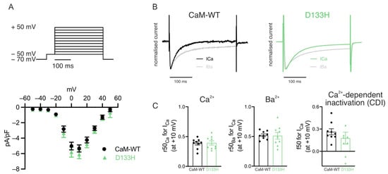 Cav1.2. Cav1.2 currents were recorded in the HEK293-Cav1.2 cell line (B’SYS, Solothurn, Switzerland), transiently transfected with CaM-WT or D133H, as previously described []. The external (bath) solution contained 140 mM NaCl, 5 mM CsCl, 0.33 mM NaH2PO4, 5 mM glucose, 10 mM HEPES, and 1 mM MgCl2 (pH 7.4, adjusted with CsOH), and was supplemented with either 2 mM CaCl2 or BaCl2 for the measurement of Ca2+ or Ba2+ currents, respectively. The internal pipette solution consisted of 140 mM CsMeSO4, 5 mM EGTA, 10 mM Cs.HEPES, 1.91 mM CaCl2 (yielding 100 nM free [Ca2+]), 1 mM MgCl2, and 1 mM Na.ATP, pH 7.2. Cells were voltage-clamped at −60 mV and depolarised to test potentials ranging from −40 to +60 mV for 300 ms, with a 2 s inter-sweep interval to allow for channel recovery. CDI (f300) was quantified as the ratio of residual current at the end of the 300 ms pulse (normalised to peak current) using either Ca2+ or Ba2+ as the charge carrier (r300): f300 = (r300Ba − r300Ca)/(r300Ba). Steady-state inactivation was evaluated using a 1 s conditioning pulse from −60 to +40 mV, followed by a 300 ms test pulse at +10 mV.