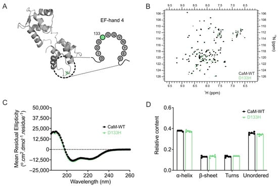 Ca2+ binding induces structural perturbations in the D133H CaM variant. Ca2+ binding is known to alter and stabilise the structure of CaM, which is crucial to its function. 1H-15N HSQC NMR of Ca2+-bound CaM-WT produced a well-dispersed spectrum with peaks of uniform intensity, consistent with a stable conformation. In contrast, D133H spectra showed heterogeneity in peak intensity, indicative of reduced stability and multiple conformational states. Spectral overlays confirmed substantial differences between the variants, with only 16.8% of residues directly overlapping and 23% assignable based on proximity to CaM-WT peaks across both lobes of the protein, indicating global structural differences (Figure 6C,D). Secondary structure analysis by CD spectroscopy revealed a decrease in α-helical content for Ca2+-bound D133H (0.51 ± 0.01) when compared to CaM-WT (0.59 ± 0.01; p < 0.0001), accompanied by a corresponding increase in unordered structures (Figure 6E,F). Together, these findings demonstrate that Ca2+ binding induces significant perturbations to the structure and conformational stability of D133H.