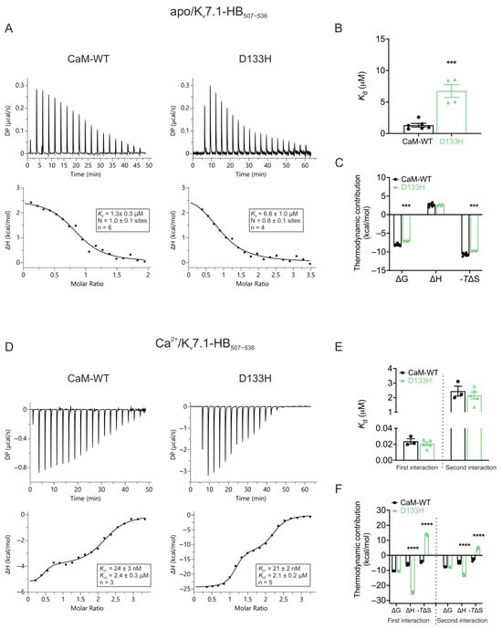 Disease-associated CaM variant D133H differentially affects apo- and Ca2+-dependent binding to Kv7.1. ITC was used to assess the interaction of CaM-WT and D133H CaM with the C-terminal helix-binding region of Kv7.1 (Kv7.1-HB507−536). In the absence of Ca2+ (apo state; Figure 9A–C), CaM-WT bound Kv7.1-HB507−536 with moderate affinity (Kd = 1.3 ± 0.3 µM). The reaction measured was endothermic, with an average stoichiometry of 1.0 ± 0.1. D133H displayed a >5-fold weaker interaction (Kd = 6.8 ± 1.0 µM; p = 0.0003), indicating reduced apo-binding affinity, along with less favourable ΔG and ΔS (Figure 9B,C). In the presence of Ca2+, two distinct binding events were observed at one- and two-fold molar excesses of Kv7.1-HB507−536. The initial high-affinity interaction (Kd = 24 ± 3 nM) was followed by a lower-affinity interaction (Kd = 2.4 ± 0.3 µM), reflecting the Ca2+-dependent switch that strengthens binding (Figure 9D,E). In this Ca2+-bound state, D133H showed binding parameters comparable to CaM-WT for both interaction events, indicating minimal impact of the mutation under these conditions. The D133H mutation disrupts the enthalpy-driven nature of CaM’s binding to the Kv7.1-HB507−536 peptide and shifts it toward a more entropy-driven interaction (Figure 9F). Overall, these data demonstrate that the D133H mutation selectively disrupts apo/CaM binding to Kv7.1-HB507−536, while Ca2+-dependent interactions remain largely intact.