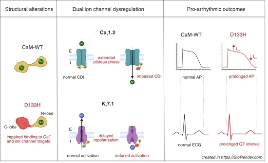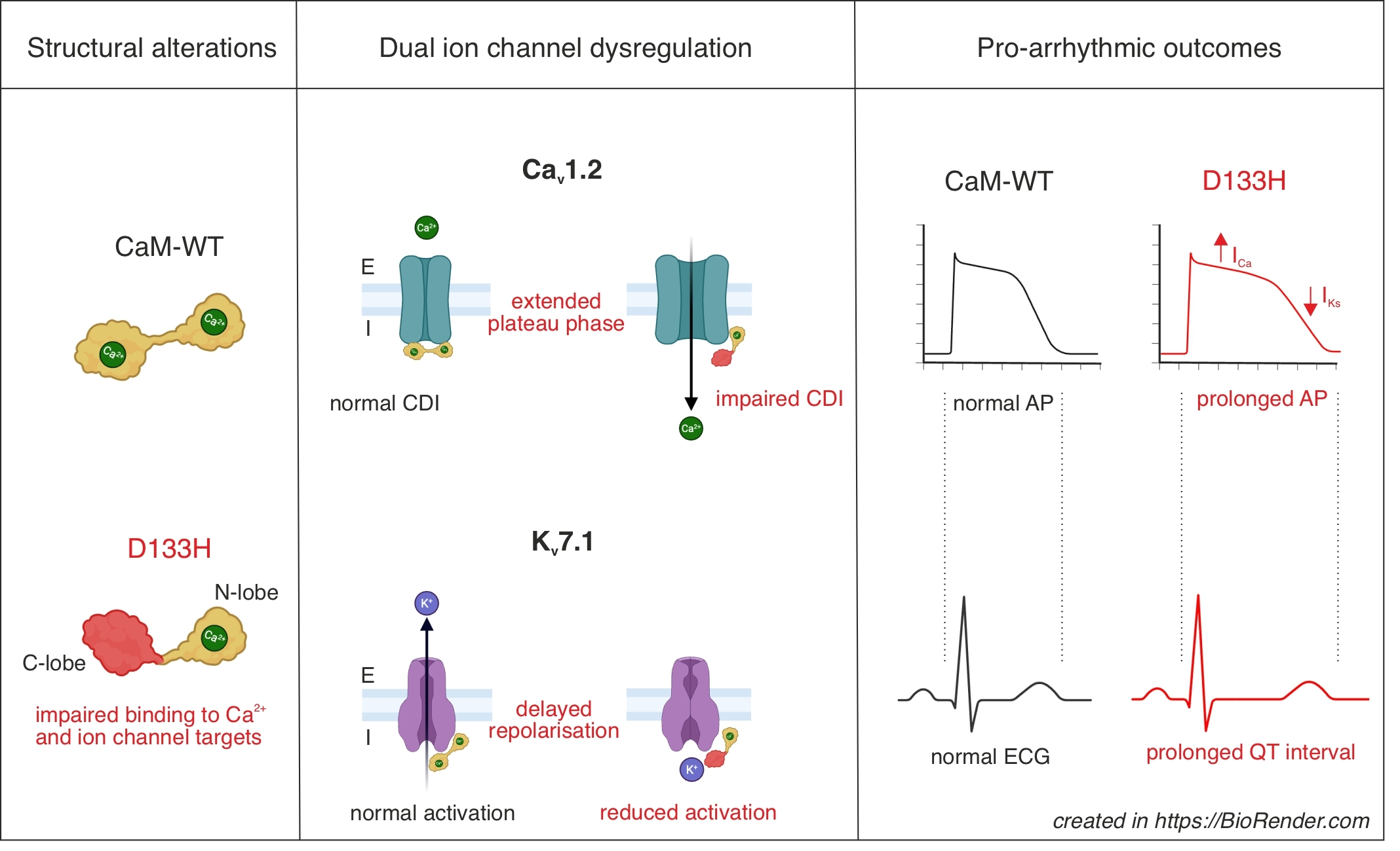 Cardiac arrhythmias such as LQTS remain a major cause of sudden death in young individuals [,]. CaM variants are increasingly recognised as pathogenic drivers, yet the molecular mechanisms linking altered CaM function to arrhythmogenesis remain poorly defined. Here, we show that the D133H CaM variant impairs Ca2+ handling and channel regulation through reduced Ca2+ binding affinity, destabilisation of Ca2+-bound conformations, and altered interactions with Cav1.2 and Kv7.1. These defects lead to prolonged APD and increased arrhythmic risk. The key findings are summarised in Table 1, Table 2 and Table 3.