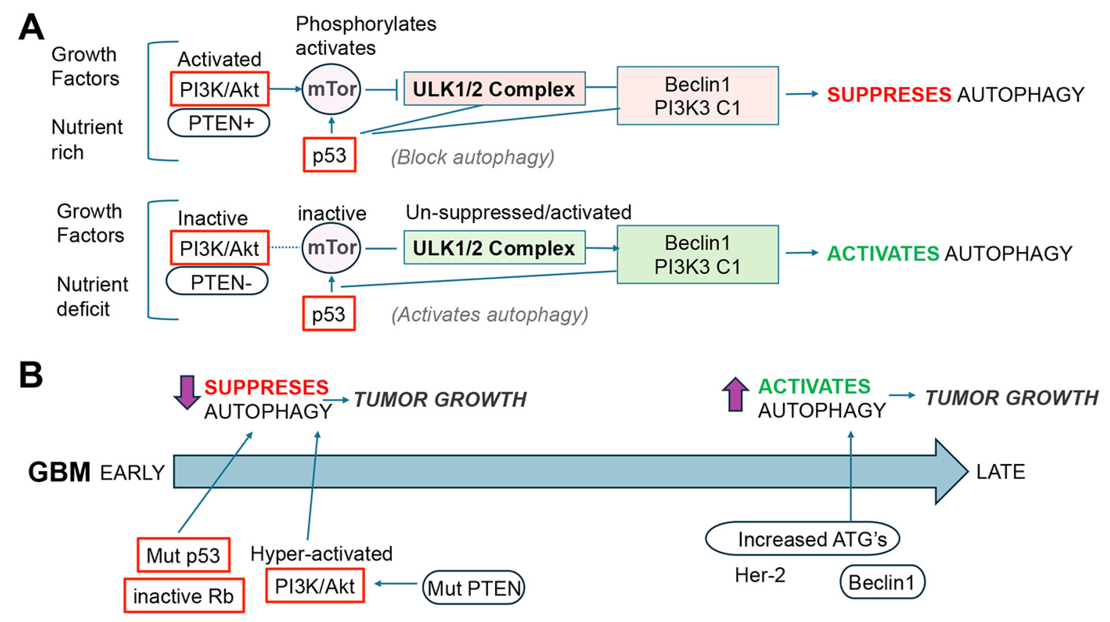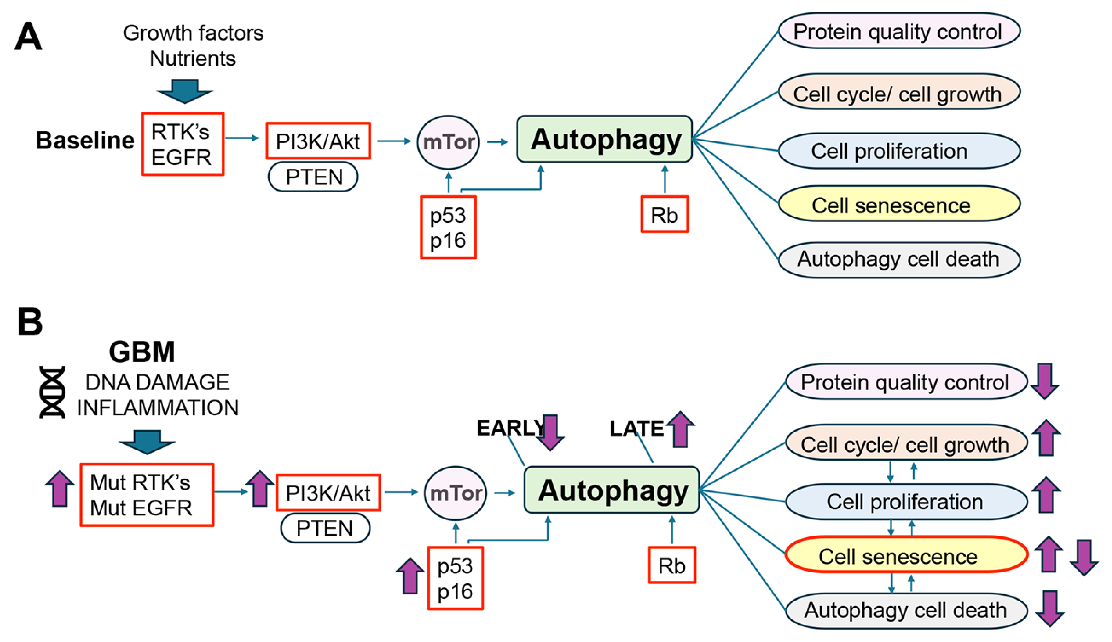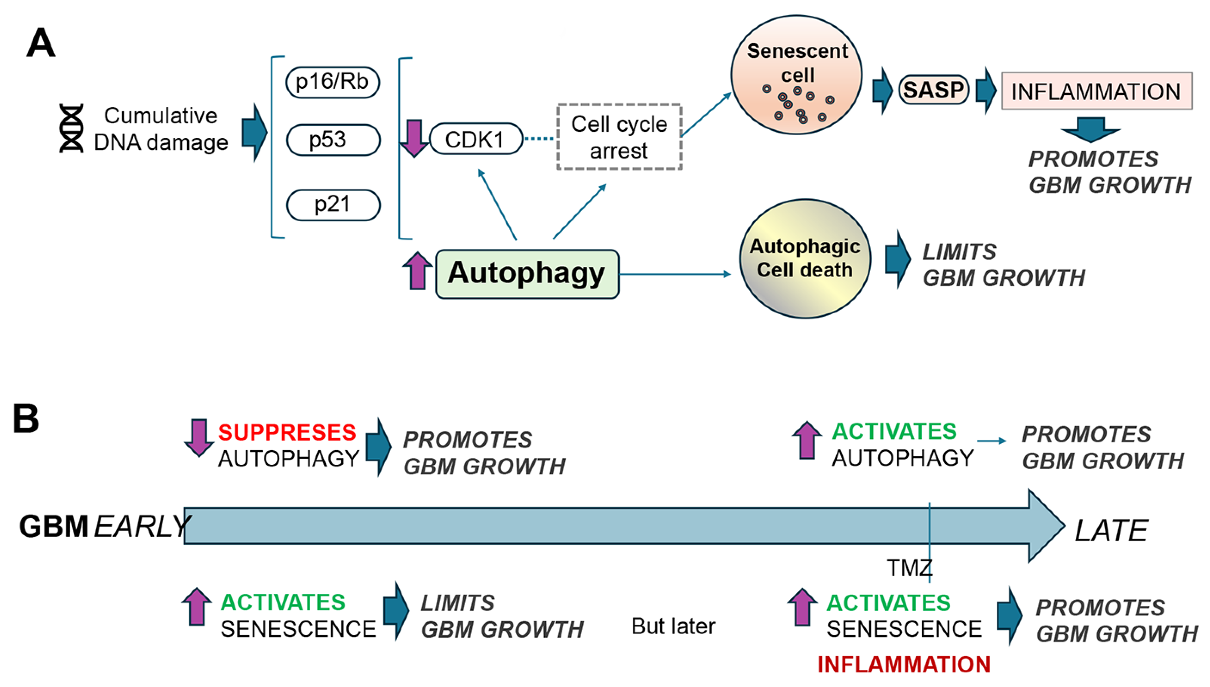 - For this review, we analyze the role of the interplay between cellular senescence and autophagy in the paradoxical effects on GBM tumor growth and suppression with the corresponding therapeutic implications.