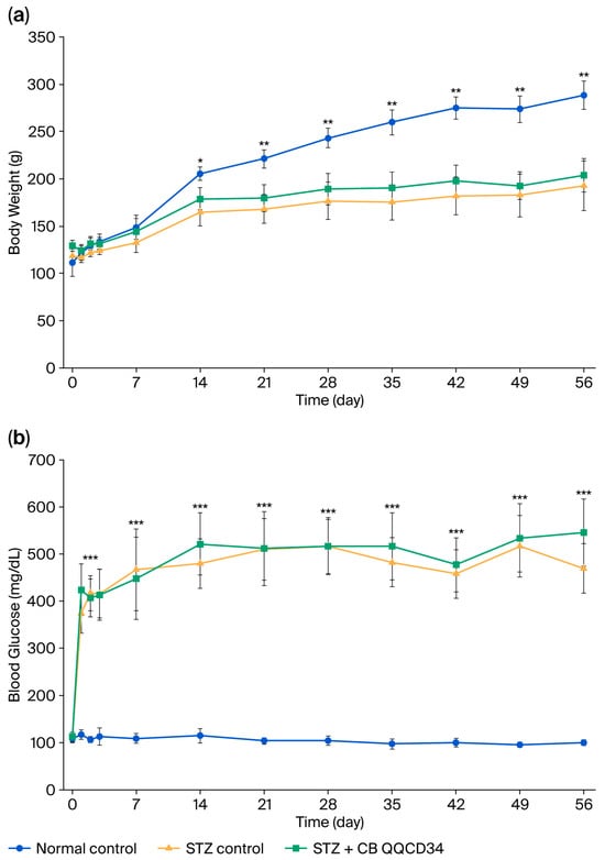 Changes in body weight and blood glucose. (a) Body weight. (b) Blood glucose. Closed circles, normal control group; closed triangles, STZ control group; closed squares, STZ-plus-cell-therapy group. * p < 0.05, ** p < 0.01 vs. normal control group; *** p < 0.001 vs. normal control group. STZ, streptozotocin.
