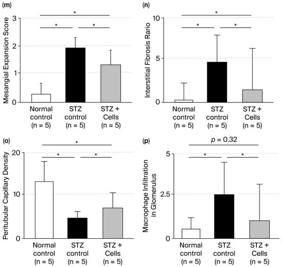 Representative photographs of mesangial matrix expansion, interstitial fibrosis, PTCs, and macrophage infiltration are shown in Figure 5a–l. Cell administration significantly improved all pathological findings, including mesangial matrix expansion, interstitial fibrosis, PTC rarefaction, and glomerular macrophage infiltration, which are representative pathological changes in diabetes. Mesangial expansion was significantly improved in the STZ-plus-cell-therapy group compared with the STZ control group (1.33 ± 0.65 vs. 1.85 ± 0.63, p < 0.0001). The interstitial fibrosis ratio (1.53 ± 1.36 vs. 4.38 ± 2.74, p < 0.0001), PTC density (6.3 ± 2.3 vs. 3.4 ± 1.5, p < 0.0001), and macrophage infiltration (0.87 ± 0.98 vs. 2.45 ± 1.79, p < 0.0001) were all significantly improved in the STZ-plus-cell-therapy group compared with the STZ control group (Figure 5m–p).