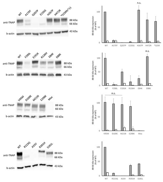 Western blot showing the expression of 66 and 88 kDa bands (on the left). Comparison, as relative expression (% of 88 or 66 kDa WT band) of mutants and quantification are plotted (on the right). Unless specified, all the comparisons are statistically significant; n.s. = not significant (for one of the two bands or for both).