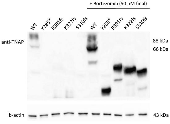 With regard to the truncating variants (S310fs, Y285*, R391fs, and K322fs), we investigated whether they were sensitive to proteasome-mediated degradation, as expected for other mutants [11]. Thus, we repeated the western blotting under the same conditions, but in the presence of the bortezomib, a known strong proteasome inhibitor [12]. Twenty-four hours after the transfection, the drug was added (Selleck, Houston, TX, USA, 50 uM final concentration), protein extraction was made after other 24 h, and lysates were loaded onto a 7.5% SDS PAGE and blotted as described above.