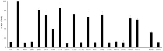 The assay showed an impairment of the enzymatic activity for all mutants. Concerning missense variants, the decrease of enzymatic activity ranged from 20% for E88K to almost total loss of activity for the E84K. In line with their presumed total loss of function, mutants Y285*, S310fs, K322fs, and R391fs showed a REA similar to the background noise of untreated cells (Figure 3), suggesting that these mutants could be considered as additional internal controls, confirming the reliability of the assay.