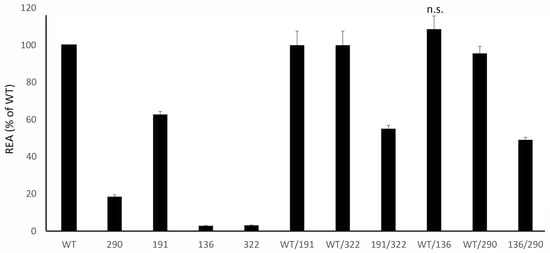 Residual Enzymatic Activity REA of mutants identified in compound heterozygotes patients, tested alone (on the left) and in combination (on the right) and plotted (% of WT). Please see the text for further comments; unless specified, all the comparisons are statistically significant; n.s. = not significant.
