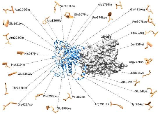 Finally, active-site/interface-proximal variants (A-SI) (E88K, V95M, E191K, E235G, and E298K) showed minimal or zero perturbations in stability, mainly related to the dimeric form. These results are consistent with their localization, as energetic calculations and static structure evaluations cannot accurately capture the impact of variants on a functional region, requiring further studies that include protein dynamics and conformational flexibility.