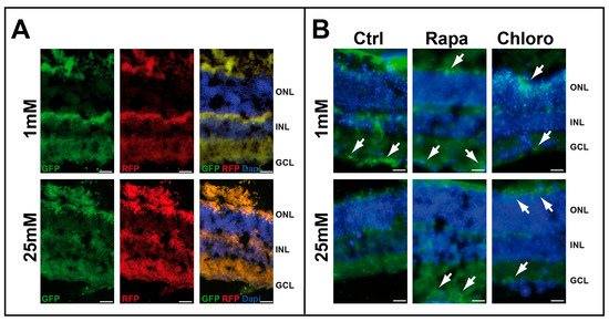 Autophagy is an essential cellular process for maintaining cellular homeostasis under both physiological and pathological conditions. Autophagy is classified as macroautophagy (often referred to simply as autophagy), chaperone-mediated autophagy, and microautophagy (for review, see [9]). The main step in autophagy is autophagosome formation, followed by a rapid fusion with lysosomes to generate AL, whose contents are degraded by lysosomal enzymes [10]; impairment of fusion can lead to autophagosome accumulation [8]. Autophagy acts as a quality control mechanism playing a key role in retinal development [11] and ocular pathologies, including DR [12,13,14,15,16]. It plays a protective role by degrading mitochondria affected by reactive oxygen species, as shown with a thioredoxin-interacting protein in DR [17]. Autophagy promotes color vision under starvation conditions [18], but it is essential for the survival of retinal ganglion cells (RGCs) [19,20].