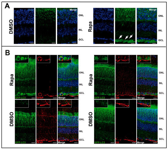 We then tested the effect of rapamycin in vivo by injecting the drug intraocularly into GFP-LC3tg/+ mice (Figure S1). GFP clearly concentrated in the ganglion cell layer (GCL), demonstrating autophagosome accumulation in this part of the retina (Figure 2A). This result also suggests that the GFP-LC3tg/+ model is suitable to study autophagy in the retina. Immunostaining with glial fibrillary acidic protein (GFAP) or glutamine synthetase (GS) showed that these two proteins colocalized with GFP in some ganglion cells, but not exclusively (Figure 2B); some cells exhibited autophagosome formation but were negative for both GFAP and GS.
